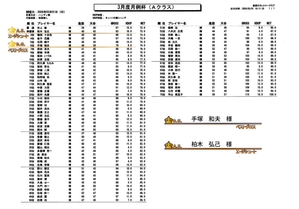 令和8年3月度 月例杯結果
