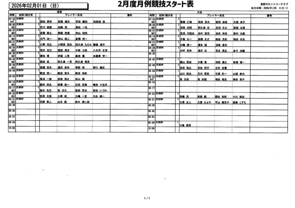 【月例組合せ】2026年02月度月例競技会スタート表 (1月25日11時現在)